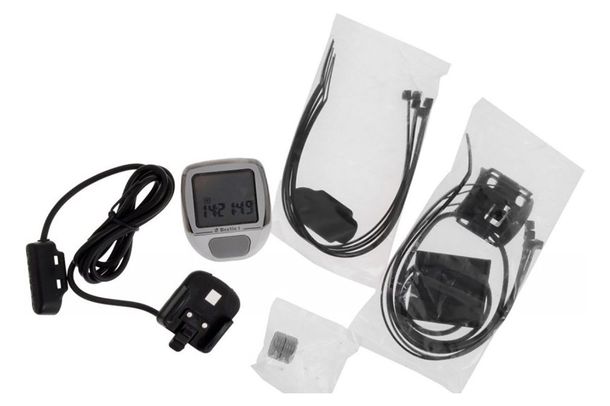 Проводной велокомпьютер "Beetle-1" с пятью функциями в стильном корпусе, имеет отличную водо и пылезащиту, функции текущая скорость, дневная дистанция (обнуляется через 6 часов стоянки), общий пробег (одометр), время в пути, часы